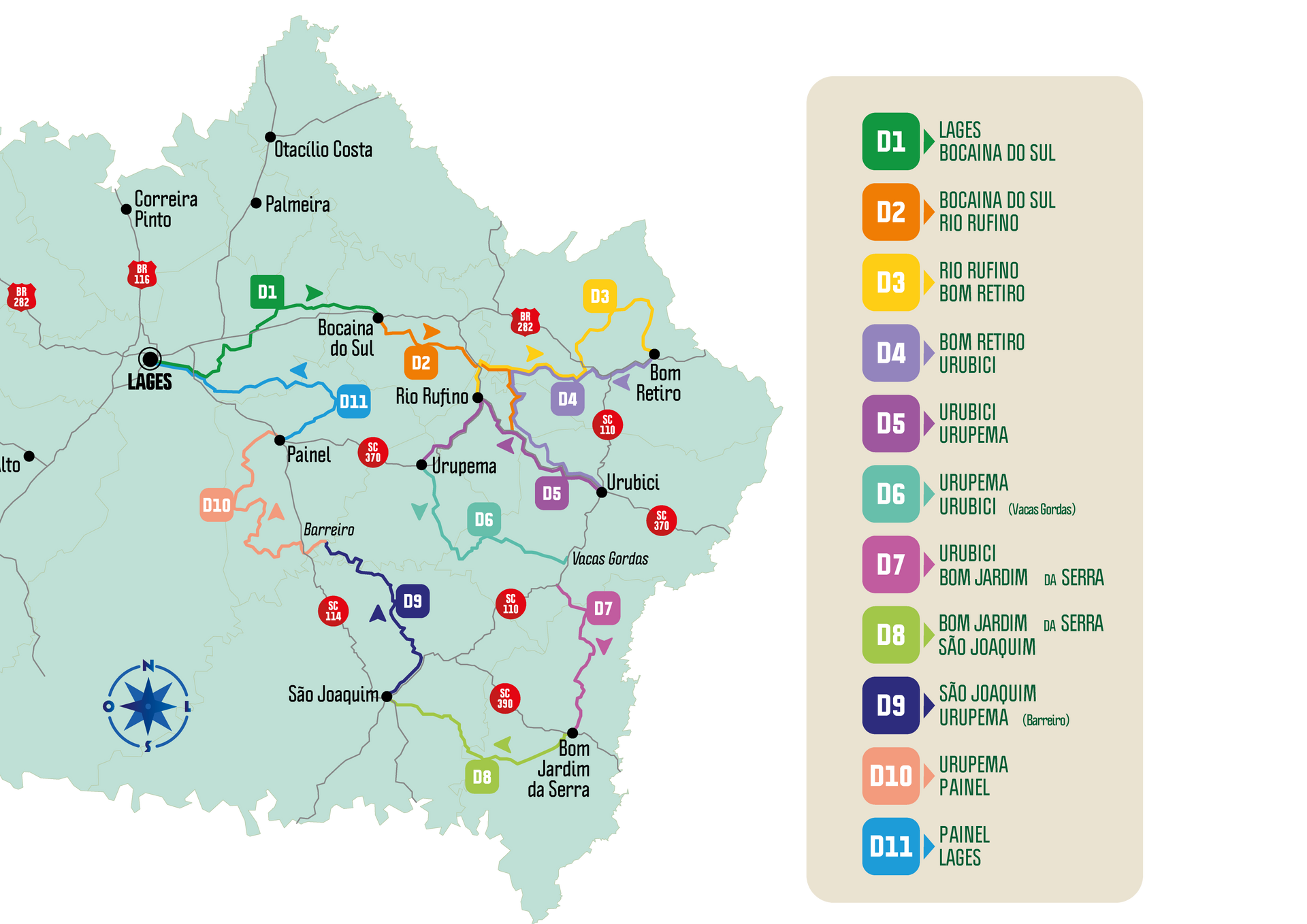 Esse circuito é perfeito para quem quer se conectar por um tempo maior e fazer uma imersão inesquecível na Serra Catarinense com 600 km de percurso em até 11 dias. Para quem prefere encurtar o tempo de viagem é possível fazer parte do circuito em 7 dias (Circuito Taipas) ou em 4 dias (Circuito Altos da Serra).